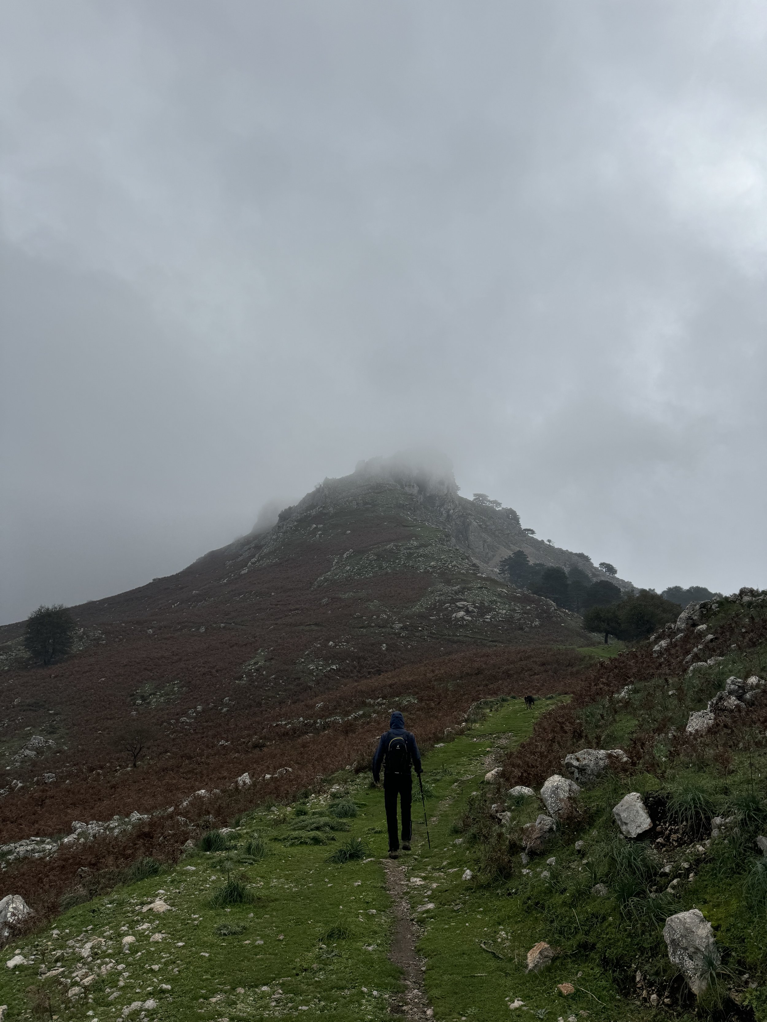 Wir parken und laufen los. Inzwischen nieselt es. Gut, dass ich die Hälfte meiner Klamotten bei dem schönen Wetter zu Hause gelassen habe. Wenigstens finden wir im VW-Bus noch Regenjacken, und los geht’s. Ich sage gerade zu Susanne, dass das genau mein Wetter ist, als der Regen noch stärker wird. Inzwischen sieht man den Berg nicht mehr, und wir brechen unsere Flucht ab. Wenigstens haben wir es versucht. Auf dem Weg zurück sehen wir Schafe und Ziegen. Sie fliehen auch – allerdings sind sie härter im Nehmen und sehen trotz Regen recht munter aus. Marc eigentlich auch – wandern macht er nur mir zuliebe mit, je kürzer, desto besser, und politisch ist er eh desillusioniert.