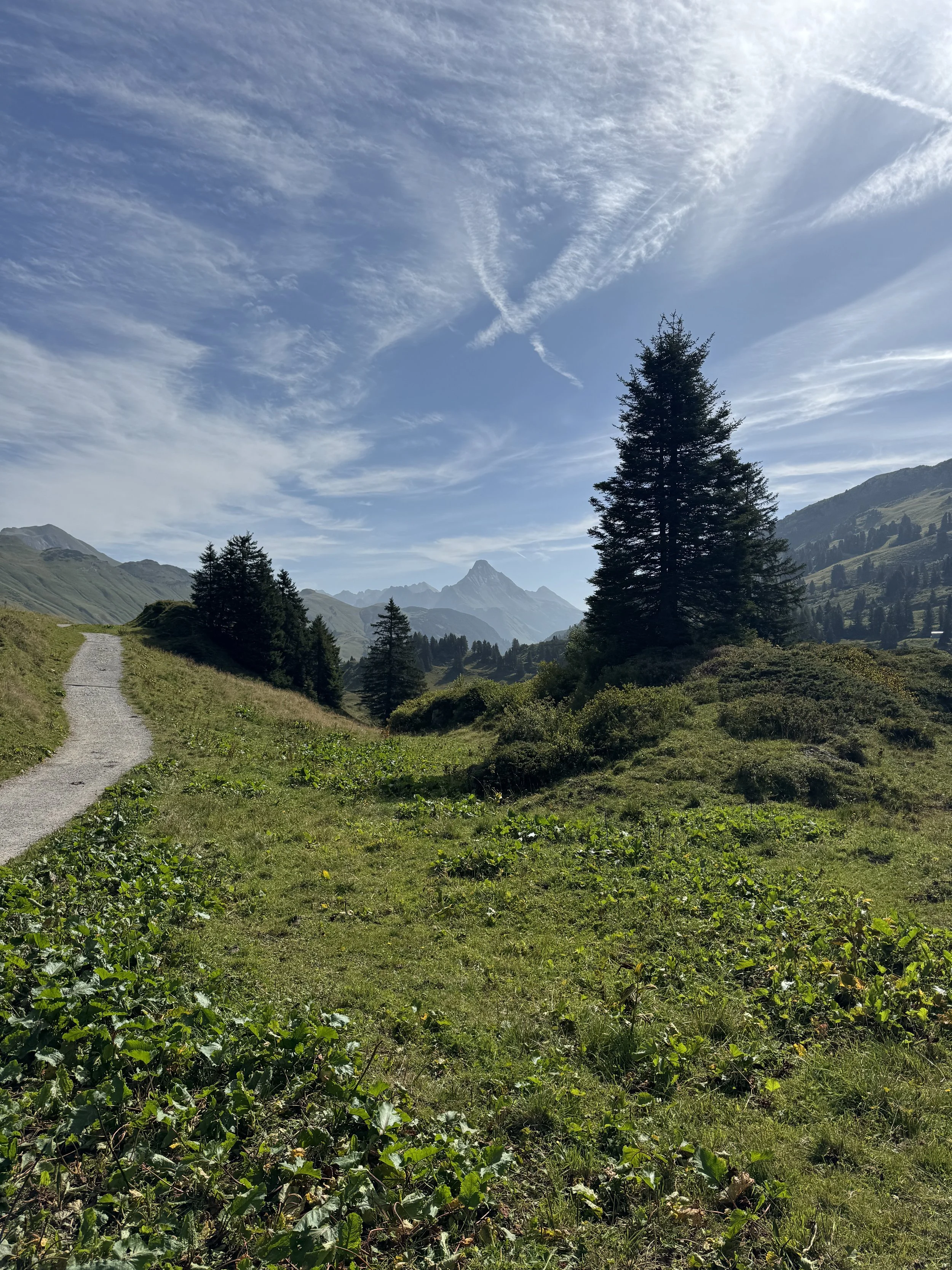 Wir starten Richtung Hochtannbergpass. Bis dahin muss man nichts entscheiden. Der breite Wanderweg geht einige Kilometer bergauf durch die grünen Wiesen und Heide.