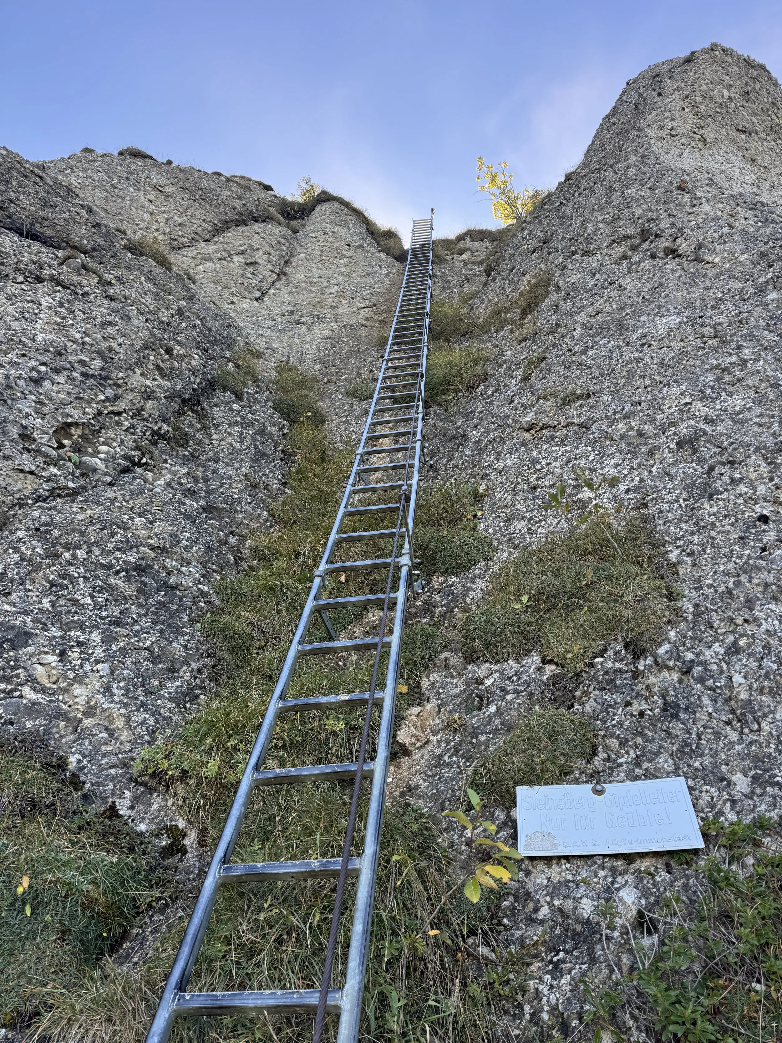 Allerdings klettern Wanderer hoch: zumindest machbar - scheint so. Ich kann auch nicht erkennen, ob die Kletterer irgendwas besonderes dabei haben. Probieren können wir es ja mal. Finale Entscheidungen sind heute nicht so unsere Sache. Das weiße Schild, auf dem steht, dass diese Passage nur für Geübte mit alpiner Erfahrung, Trittsicherheit und Schwindelfreiheit zu meistern ist, beeindruckt uns nicht weiter. Erfahren? Wir sind über 50. Schwindelfreiheit ist schon viel besser seit Hannah und Lotta selbstständig sind. Trittsicherheit? Ich ziehe die festen Wanderschuhe an. Gut, dass ich immer verschiedene Schuhe dabei habe (liest sich bescheuert, aber wer meine Füße hat, legt Wert auf Schuhe). Wir lassen die Rucksäcke und die Stöcke am Fuß des Berges und gehen mit unseren Trinkflaschen und Müsliriegeln bewaffnet die Angelegenheit an.