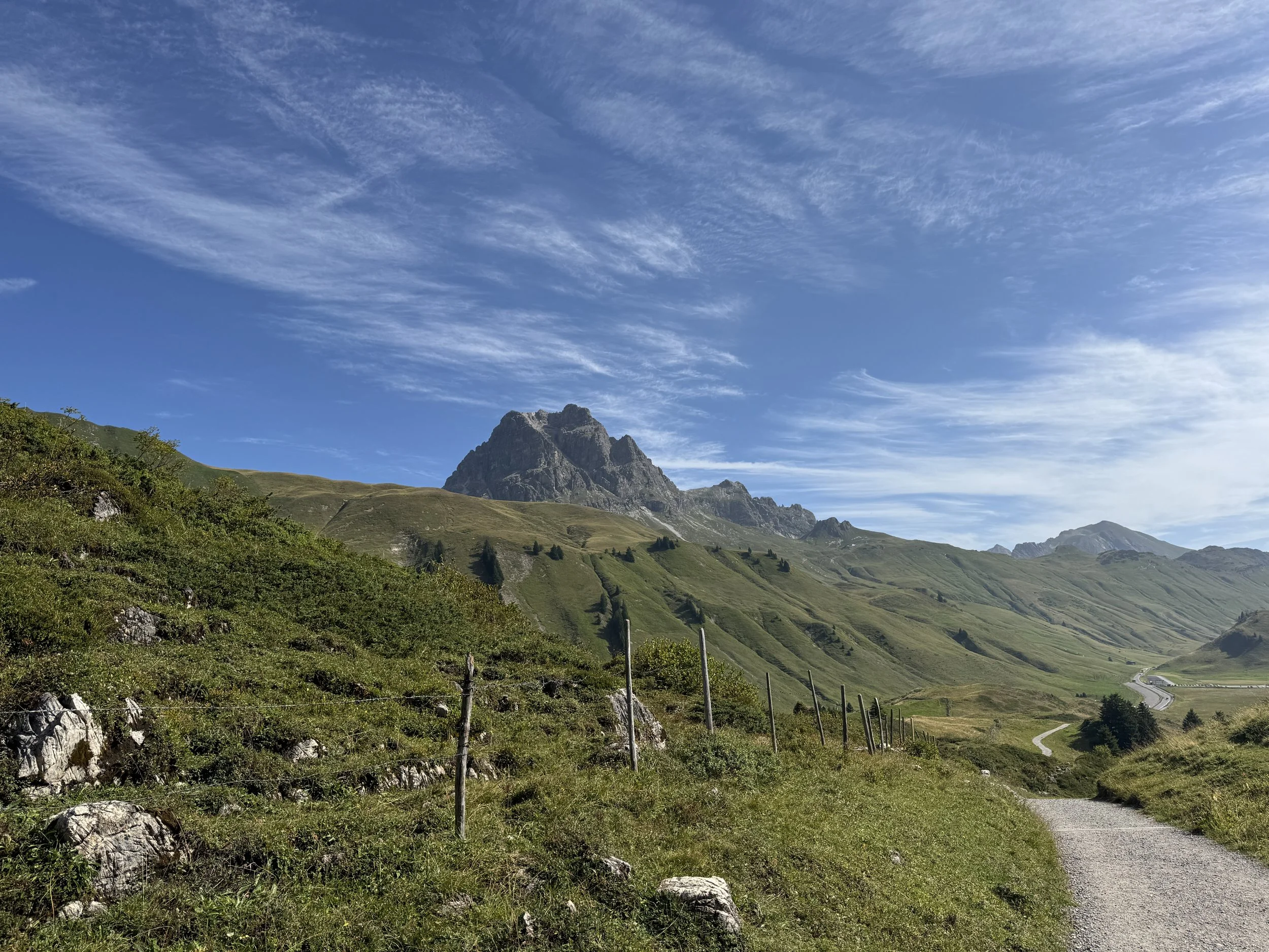 Spätestens am Pass müssen wir uns entscheiden, ob wir klettern oder lieber die Gratwanderung nehmen. Beide Optionen können wir die ganze Zeit links von uns analysieren. Ich schleppe unsere Wasserflaschen und denke: so viel Wasser wie ich trage, können wir selbst mit Milou nicht trinken. Außerdem laufen wir die ganze Zeit an Wasser vorbei. Zunächst die Teiche kurz vor dem Pass. Dann ein Brunnen. Zwei kleinere Gasthäuser und über uns auf der linken Seite sehen wir bereits die Widdersteinhütte, bei der man auch trinken kann. Wasser war knapp am Karhorn. Das Topthema heute - also habe ich viel dabei. Am Pass: der markante Klotz über uns beeindruckt uns doch mehr als der Grat, der im satten Grün parallel zu unserer Straße über uns verläuft. Wir sehen die Hänge, die von den Walsern beackert wurden. Vor uns die Passtrasse, im Hintergrufnd die Lechthaler Alpen. Wer den Biberkopf nicht sieht, läuft in die falsche Richtung.