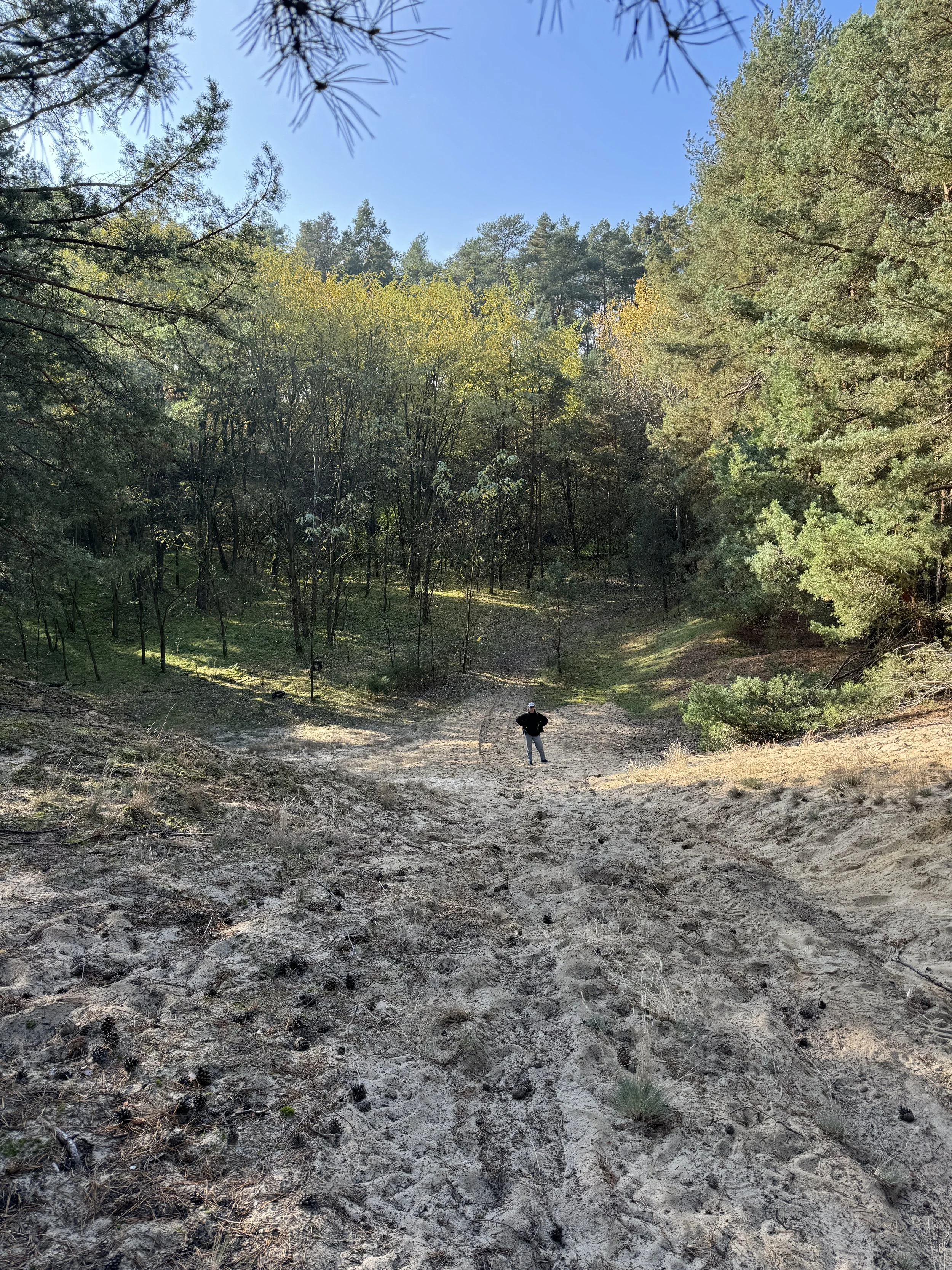 Beim Streitberg handelt es sich eher um ein Tal, in dem zwei kleine Tümpel sind. Links geht es hoch in die Kieferwälder, rechts in die Laubwälder. Wild und urtümlich. Deshalb folgen wir am ersten Weiher auch dem rechten Weg und nicht dem linken größeren. Unser Weg wird immer mehr zum Trampelpfad und eigentlich habe ich mich verlaufen. Merkt aber keiner. Hannah kümmert sich um Ruby und Ruby um sich selbst. Jedenfalls kommen wir irgendwann nicht mehr weiter und kraxeln im Zickzack hoch auf den Kamm. Hier laufen wir weiter. Wir erreichen eine Düne. Ich sehe sie heute das erste Mal – Wanderdüne.